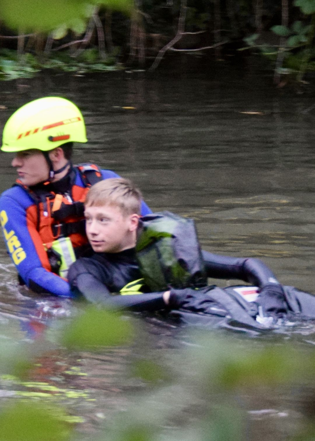 Gezielt wurden sie durch den Sanitätstrupp zu den im Wasser treibenden Personen gelotst. Innerhalb kurzer Zeit gelang die Rettung beider Personen aus der Strömung. Anschließend erfolgten die medizinische Erstversorgung und der Transport zum Übergabepunkt an den Rettungsdienst. Präzises Handeln, eingespieltes Teamwork und die Erfahrung im Umgang mit der Erft zeigten erneut die hohe Einsatzkompetenz der Strömungsretter.
