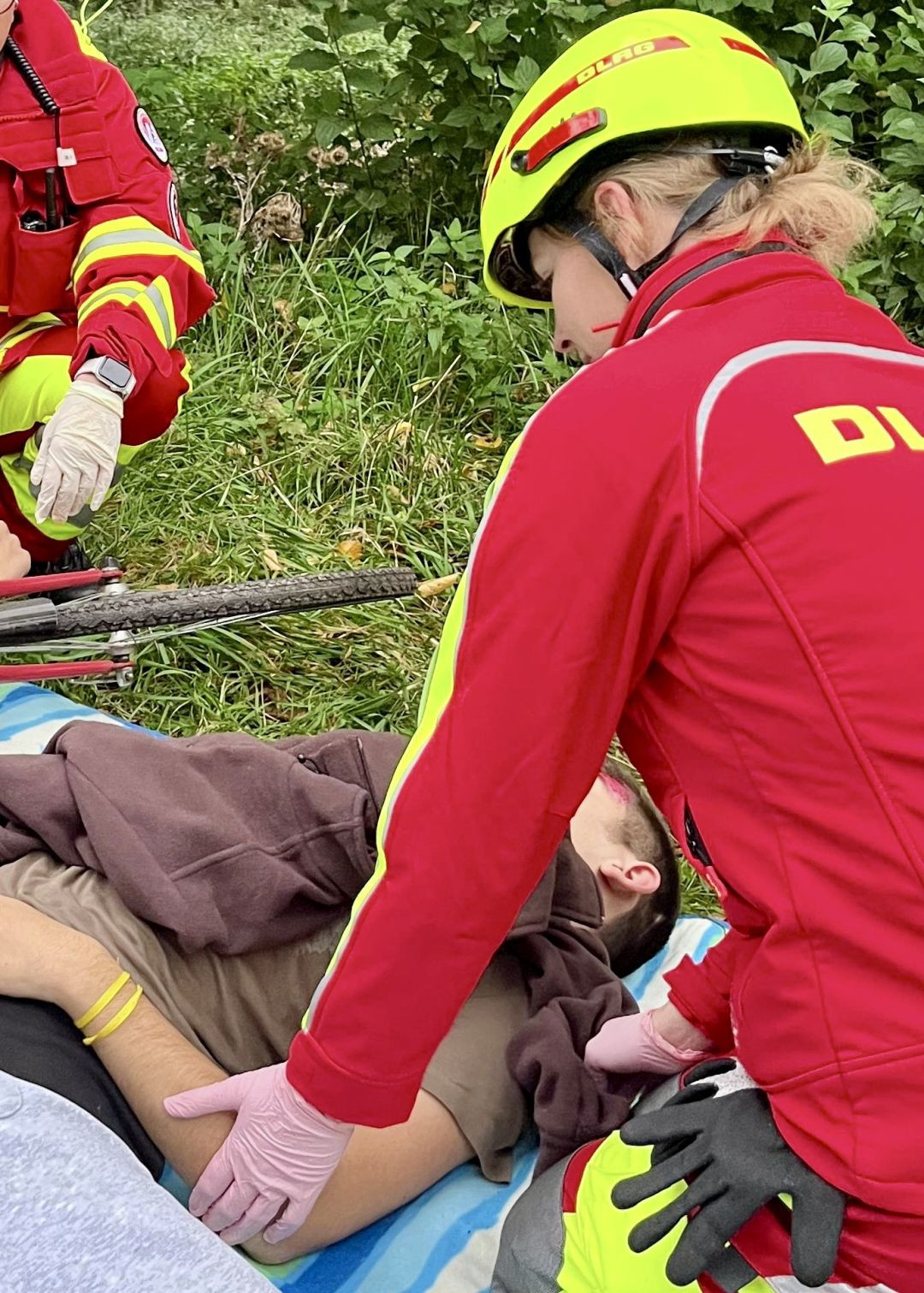 Parallel übernahm der Sanitätstrupp die Versorgung der verletzten Radfahrer, stellte die Erstversorgung sicher und organisierte den Transport zum Übergabepunkt.