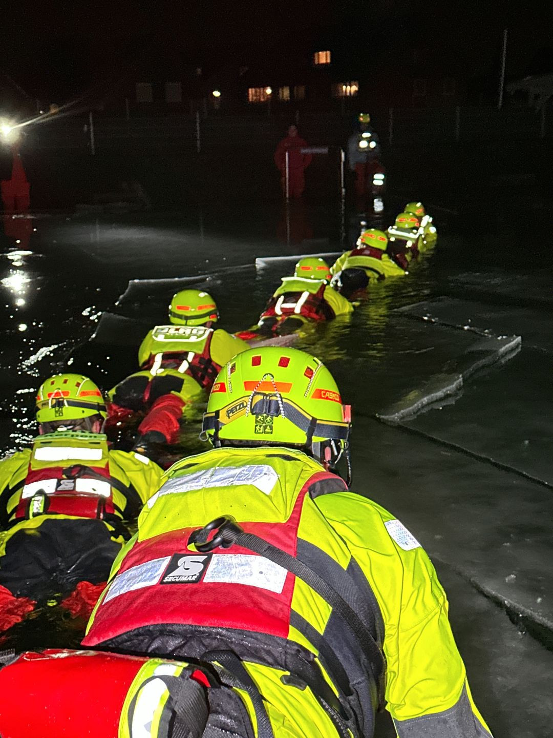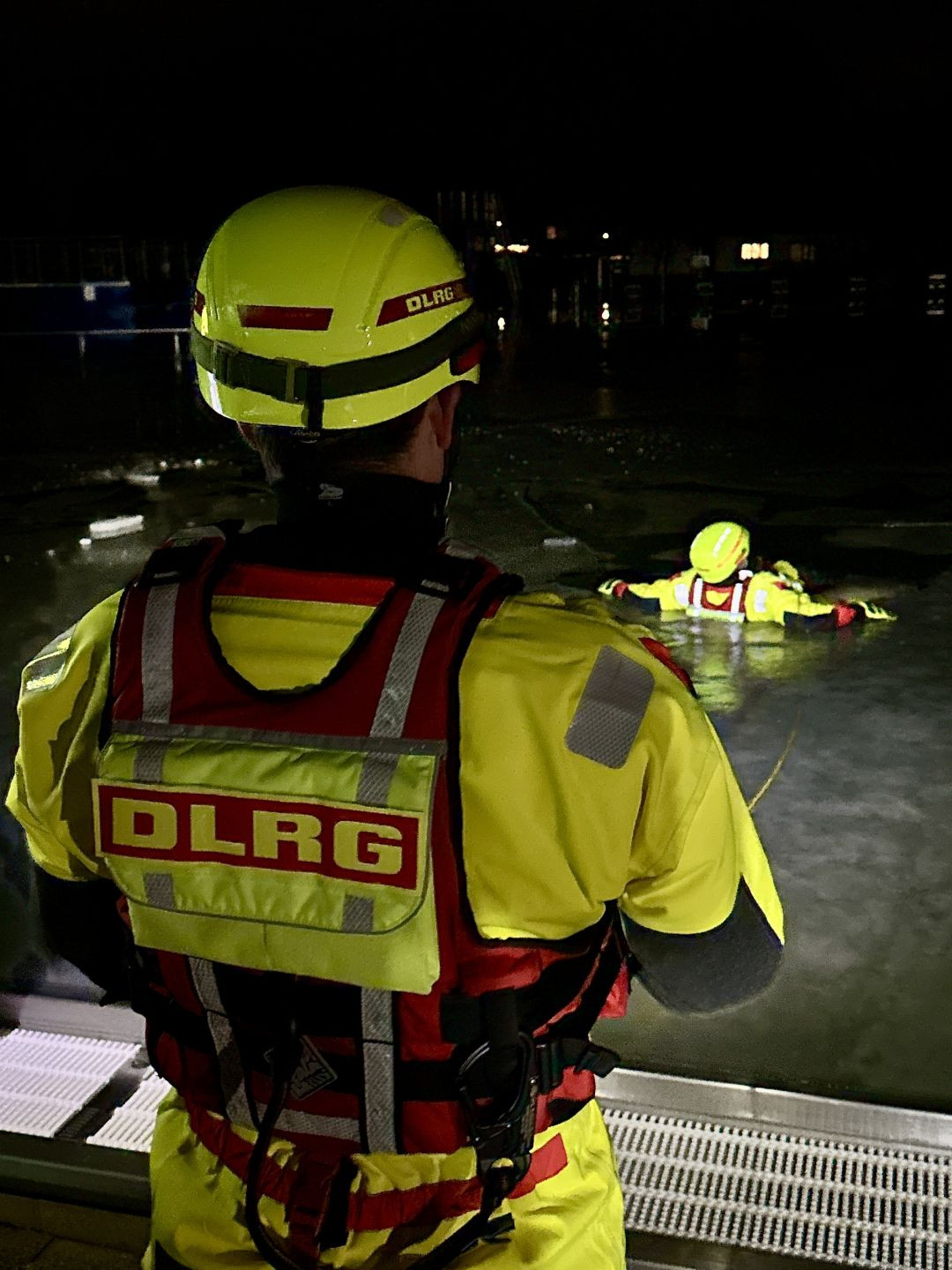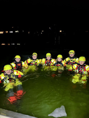 Im Rahmen des Übungsdienstes trainierten sieben Einsatzkräfte in Trockenanzügen verschiedene Techniken zur Rettung von im Eis eingebrochenen Personen. Dabei lag der Fokus sowohl auf der Eigensicherung als auch auf dem koordinierten Vorgehen im Einsatzfall. Die realitätsnahen Bedingungen boten eine wertvolle Möglichkeit, Abläufe zu festigen und Erfahrungen auszutauschen.